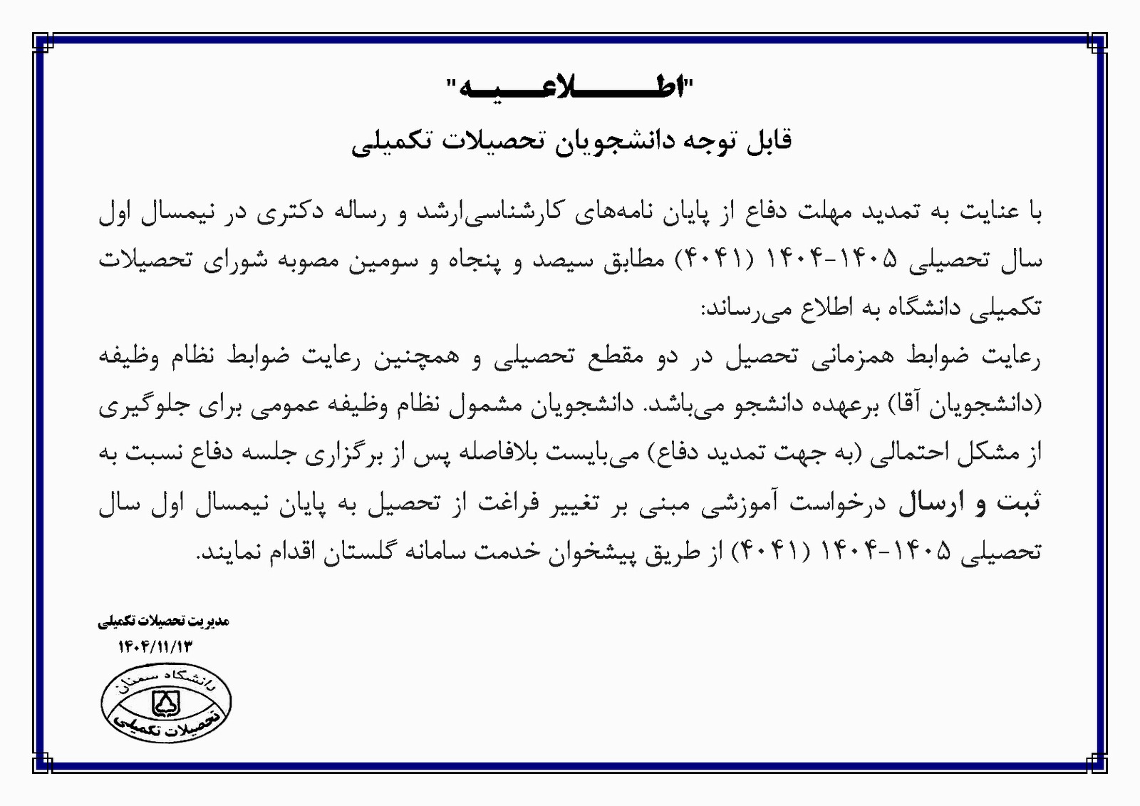 اطلاعیه ویژه دانشجویان مقاطع تحصیلات تکمیلی پردیس علوم و فناوری های نوین دانشگاه سمنان 1404/11/19 - 10:11 تعداد بازدید: 28 کلمات کلیدی