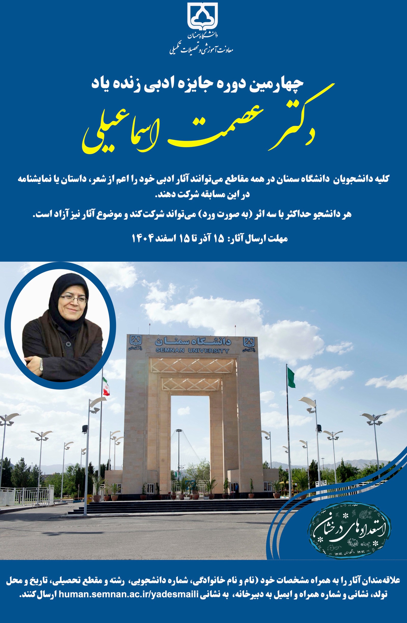 - معاونت فرهنگی و اجتماعی دانشگاه سمنان با افتخار چهارمین دوره جایزه ادبی زنده‌یاد دکتر عصمت اسماعیلی را برگزار می‌کند.