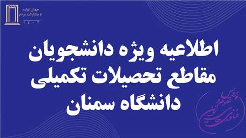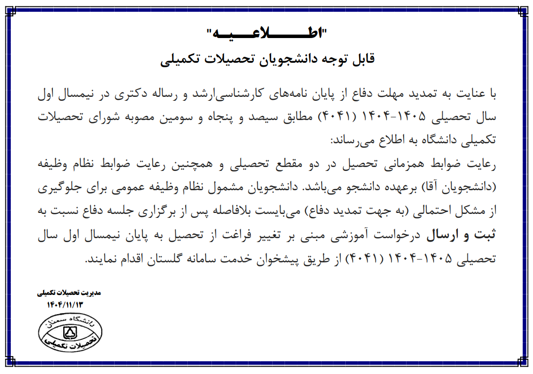 اطلاعیه ویژه دانشجویان مقاطع تحصیلات تکمیلی دانشگاه سمنان 1404/11/14 - 12:18 تعداد بازدید: 39 کلمات کلیدی