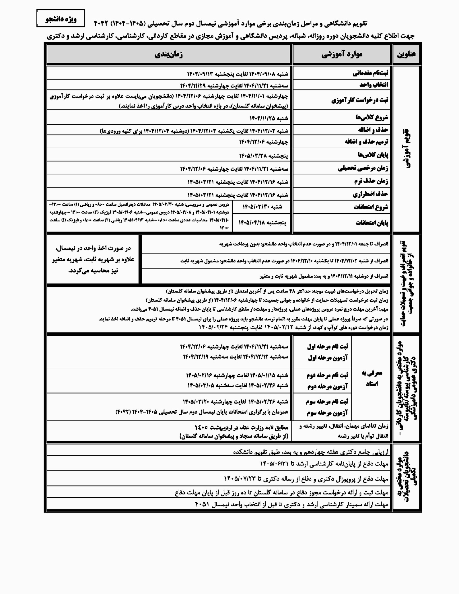 تقویم آموزشی پردیس علوم و فناوری های نوین ۴۰۴۲ 1404/11/14 - 12:27 تعداد بازدید: 34 تقویم آموزشی دانشگاه برای نیمسال دوم سال تحصیلی ۱۴۰۵-۱۴۰۴ (۴۰۴۲) کلمات کلیدی